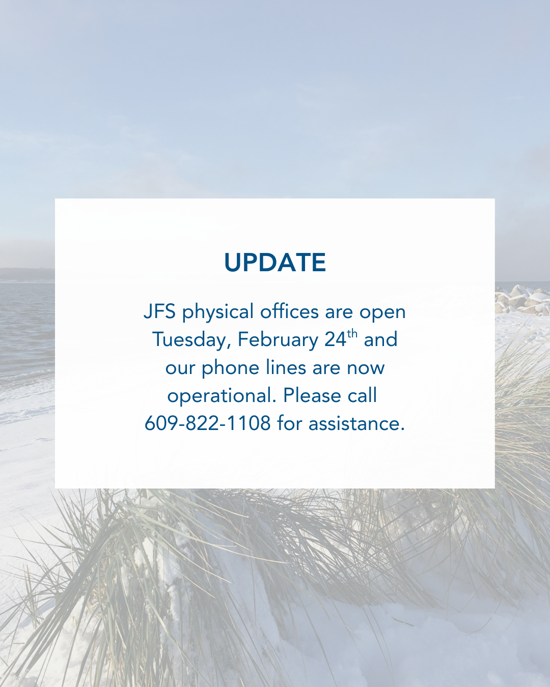 JFS operations are remote for Monday, February 23rd. Incoming calls to the agency (609-822-1108) are currently down. For immediate needs, please utilize our JFS On-Call number – 609-287-2466.